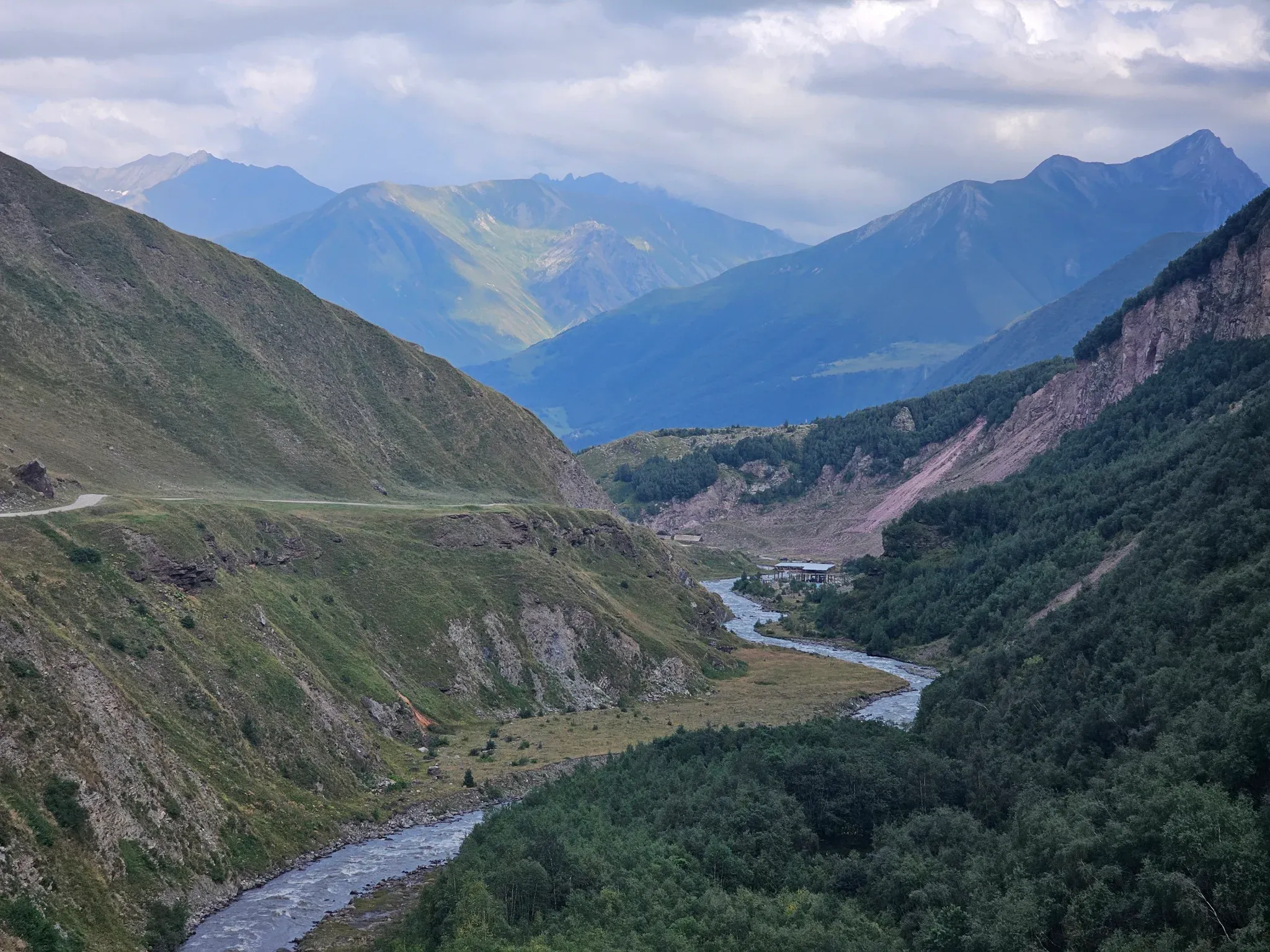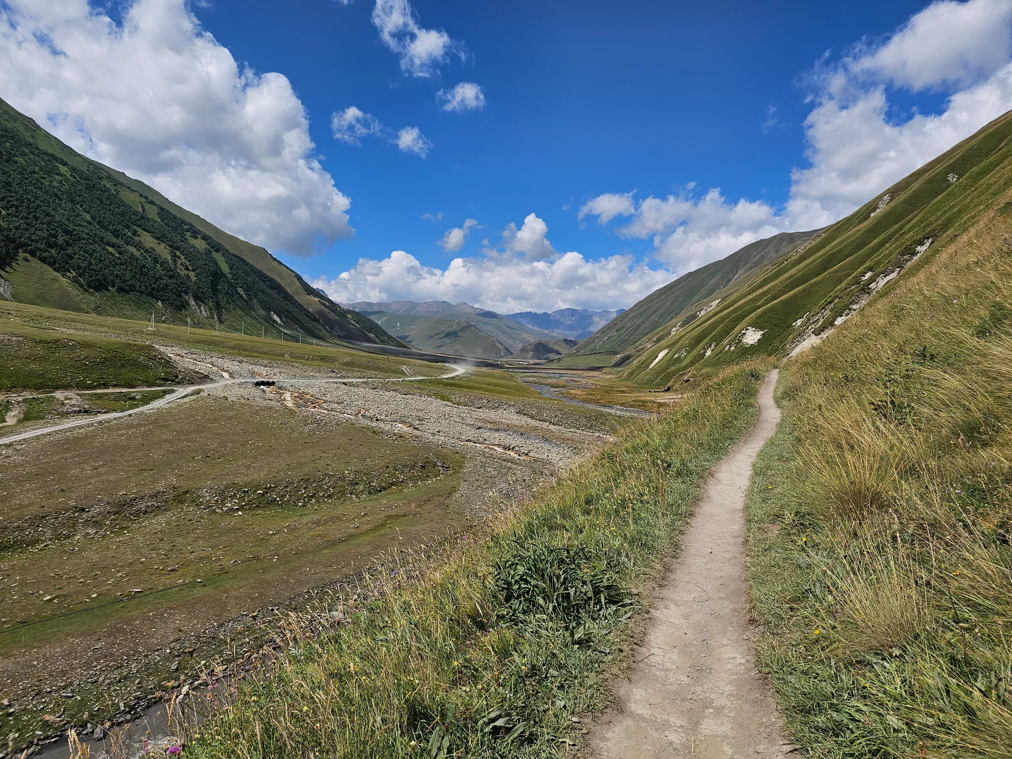 Мы долго думали, нужна ли нам машина в этой поездке, потому что только два хайка из запланированных нами были в Степанцминде. Но в интернете нашли, что есть удобный трансфер, так что решили, что обойдемся без. На месте мы выяснили, что у нас два варианта: или договариваться с частниками, или бронировать место в “автобусе” от местной туристической фирмы. Несмотря на название, это вообще не автобусы, а просто минивэны, в которых всего 7 мест, и которые ходят в большинство интересных мест вокруг 1-2 раза в день. Плюсы: довольно дешево и удобно; минусы: жестко привязан ко времени. Мы бронировали предыдущим вечером, поэтому на первый автобус (около 9 утра) мы не попали, пришлось выезжать позже (около 11). Не совсем наш вариант, особенно с учетом того, что еще около часа занимает дорога, но выбора уже не было. Время обратного автобуса строго фиксировано, так что мы переживали, что придется сокращать довольно длинный запланированный маршрут.
